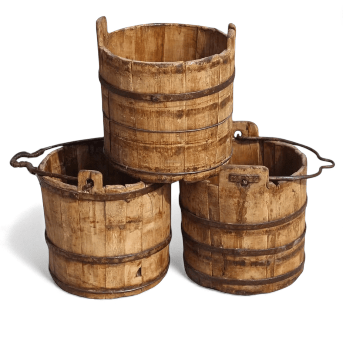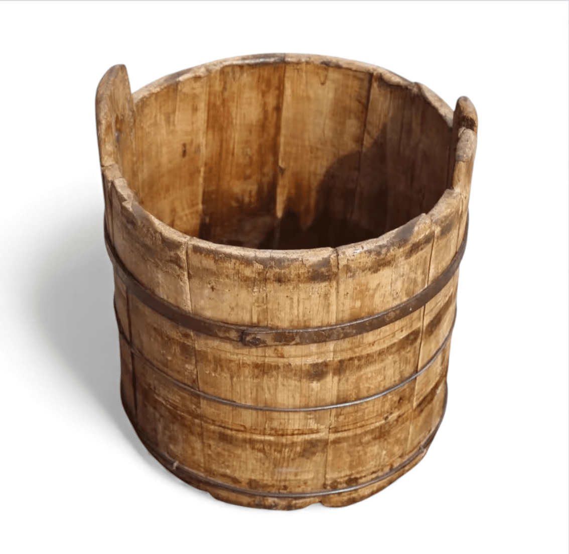 A 100-year-old handcrafted wooden water bucket. Natural patina, visible wear, and subtle variations make every piece unique.