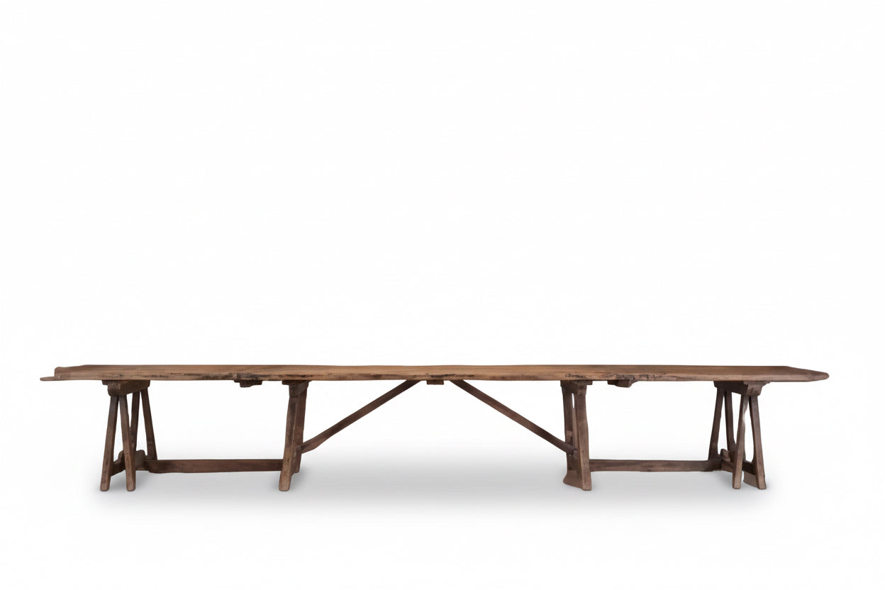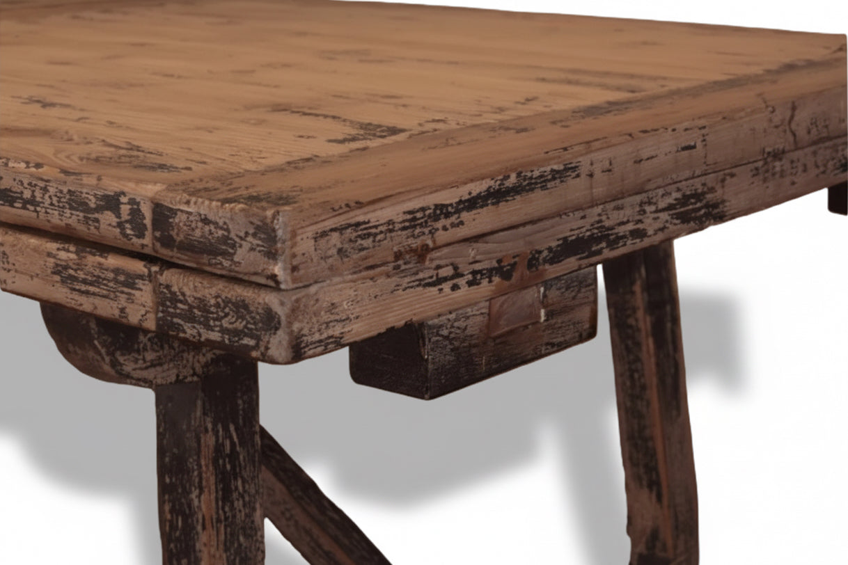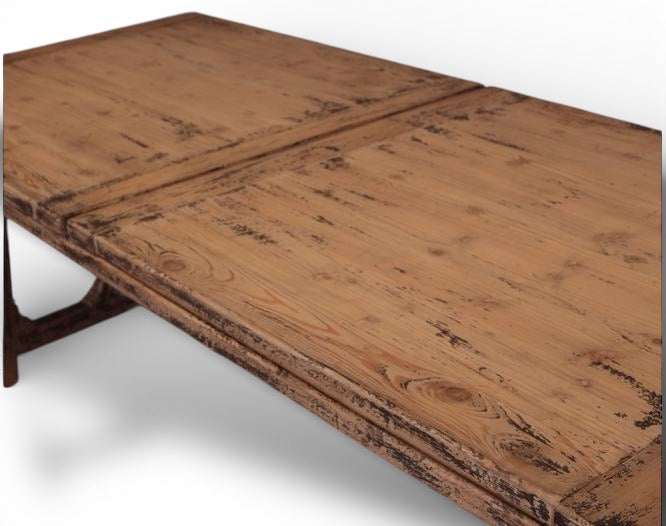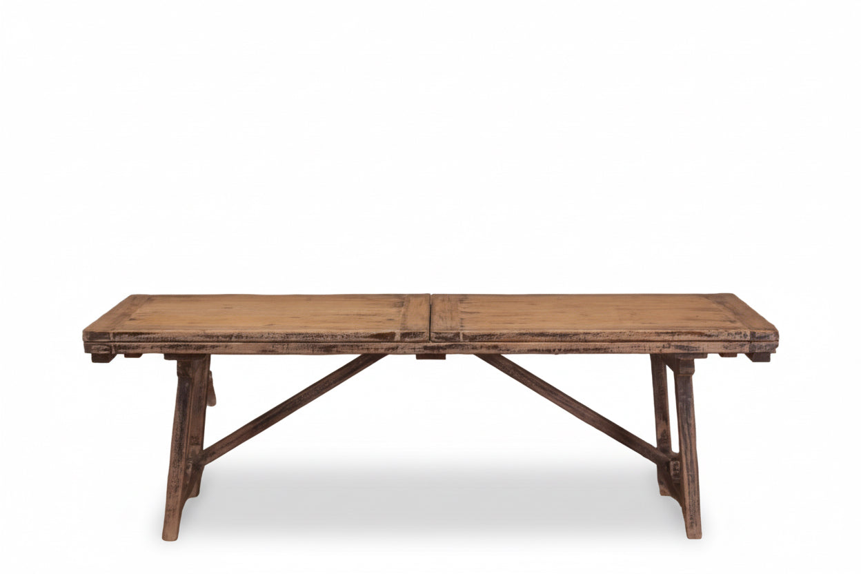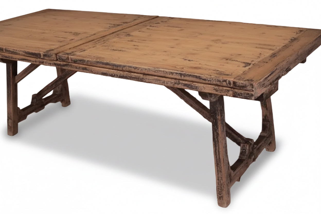 An expandable, architectural table — handcrafted from recycled pine to open fully to communal life.
